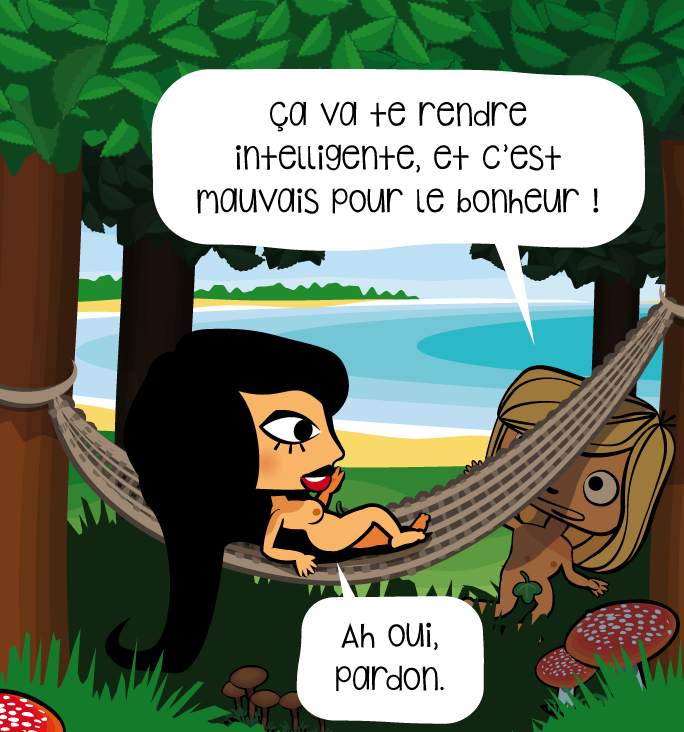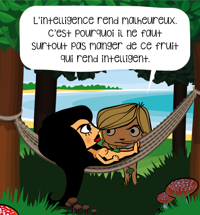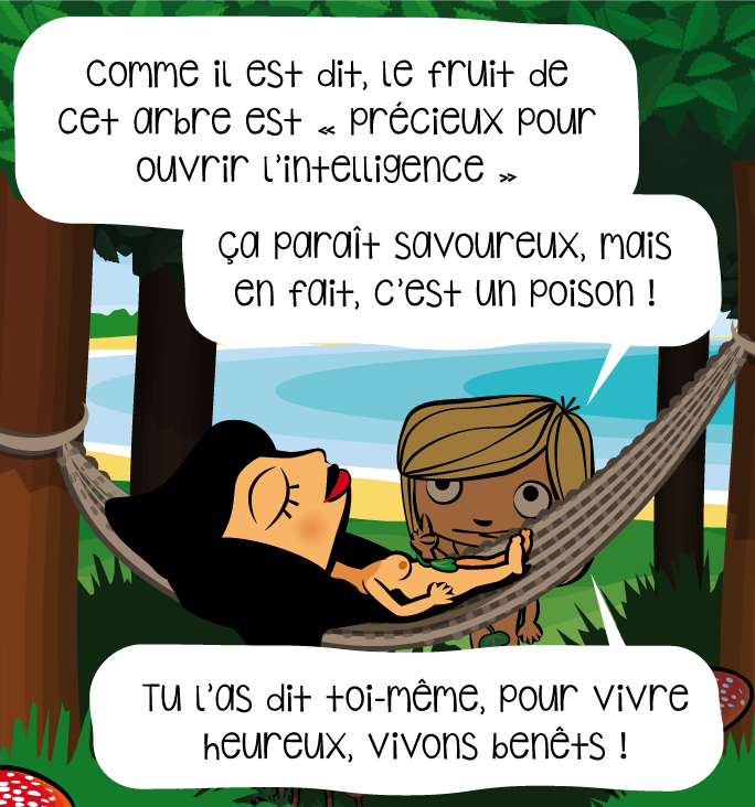 Comme il est dit, le fruit de cet arbre est « précieux pour ouvrir l'intelligence » (Ge 3.6). Ça paraît savoureux, mais en fait, c’est un poison ! Tu l’as dit toi-même, pour vivre heureux, vivons benêts ! L’intelligence rend malheureux. C’est pourquoi il ne faut surtout pas manger de ce fruit qui rend intelligent.